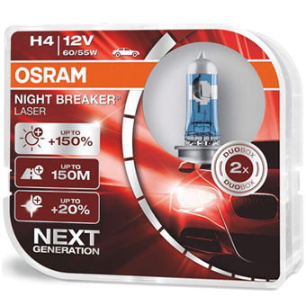 La H4 Night Breaker Laser Next Generation es la luz halógena H4 más potente de OSRAM, fabricada con tecnología de ablación laser y su filamento especial proporcionan una luz más potente y brillante que las bombillas halógenas convencionales.